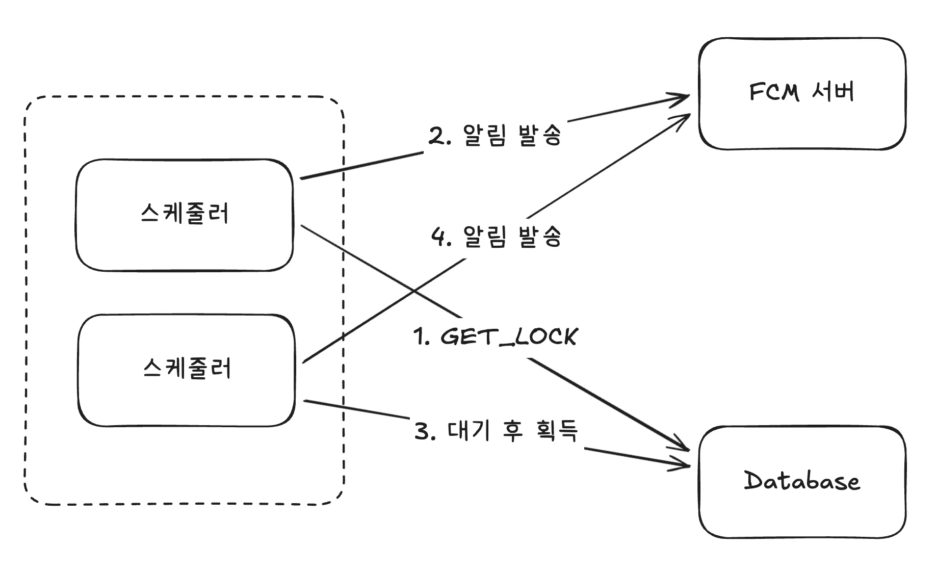 하지만 여러 인스턴스로 운영되는 분산 환경에서 이 스케줄러가 중복으로 실행되는 문제가 발생할 수 있었습니다. 두 인스턴스가 동시에 Outbox를 조회하고 같은 알림을 중복하여 발송하는 상황입니다. 사용자가 짧은 시간 안에 중복 알림을 받으면 사용자 경험이 저해됩니다.